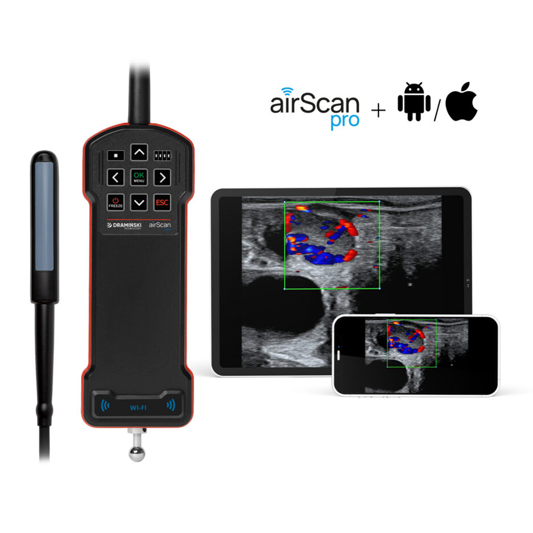 ¿Quieres llevar tus diagnósticos veterinarios de campo al siguiente nivel? Presentamos el DRAMIŃSKI airScan Pro, un escáner de ultrasonido totalmente inalámbrico, ligero y resistente, diseñado especialmente para veterinarios de grandes animales que buscan movilidad sin sacrificar calidad de imagen. Equípate con tecnología de vanguardia que se adapta a tus necesidades diarias en granjas, corrales y clínicas móviles.